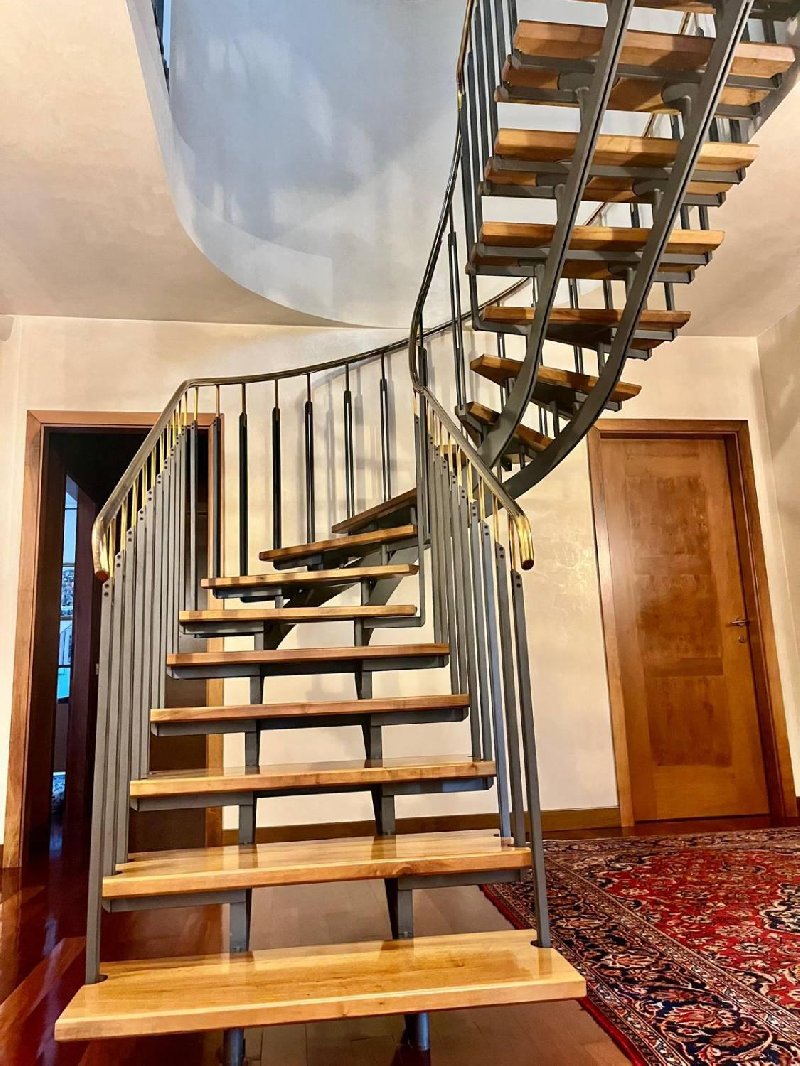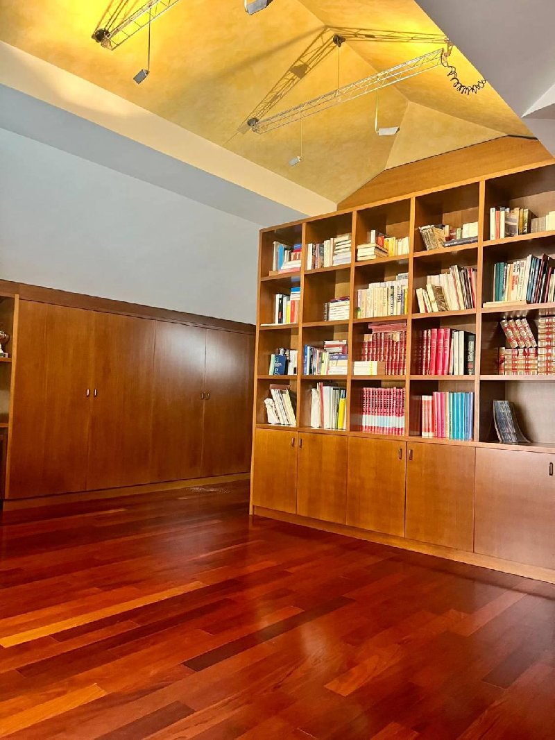 ingresso, soggiorno, cucina abitabile, lavanderia, camera padronale, guardaroba, bagno, e studio-camera per gli ospiti; al piano mansardato che accede dall'ingresso attraverso una scala molto curata nel design e preziosa nei materiali composto da due ampie camere con mobili su misura in legno pregiato, una bagno e una terza cameretta-ripostiglio.